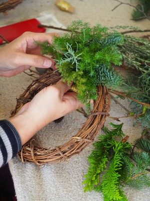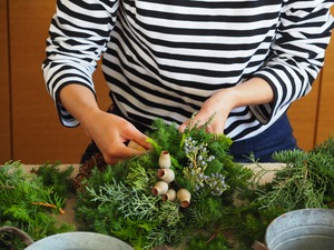 グリーンベースで生のお花のもみの木、針葉樹、ユーカリなどを