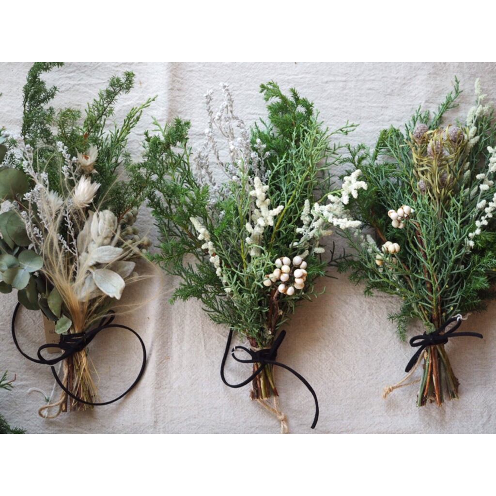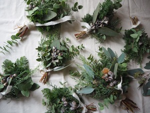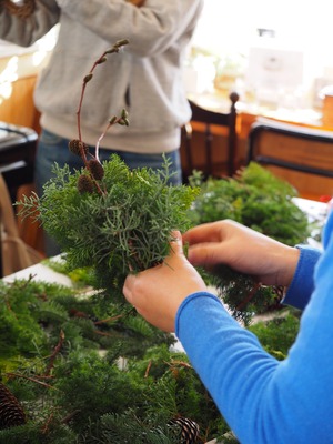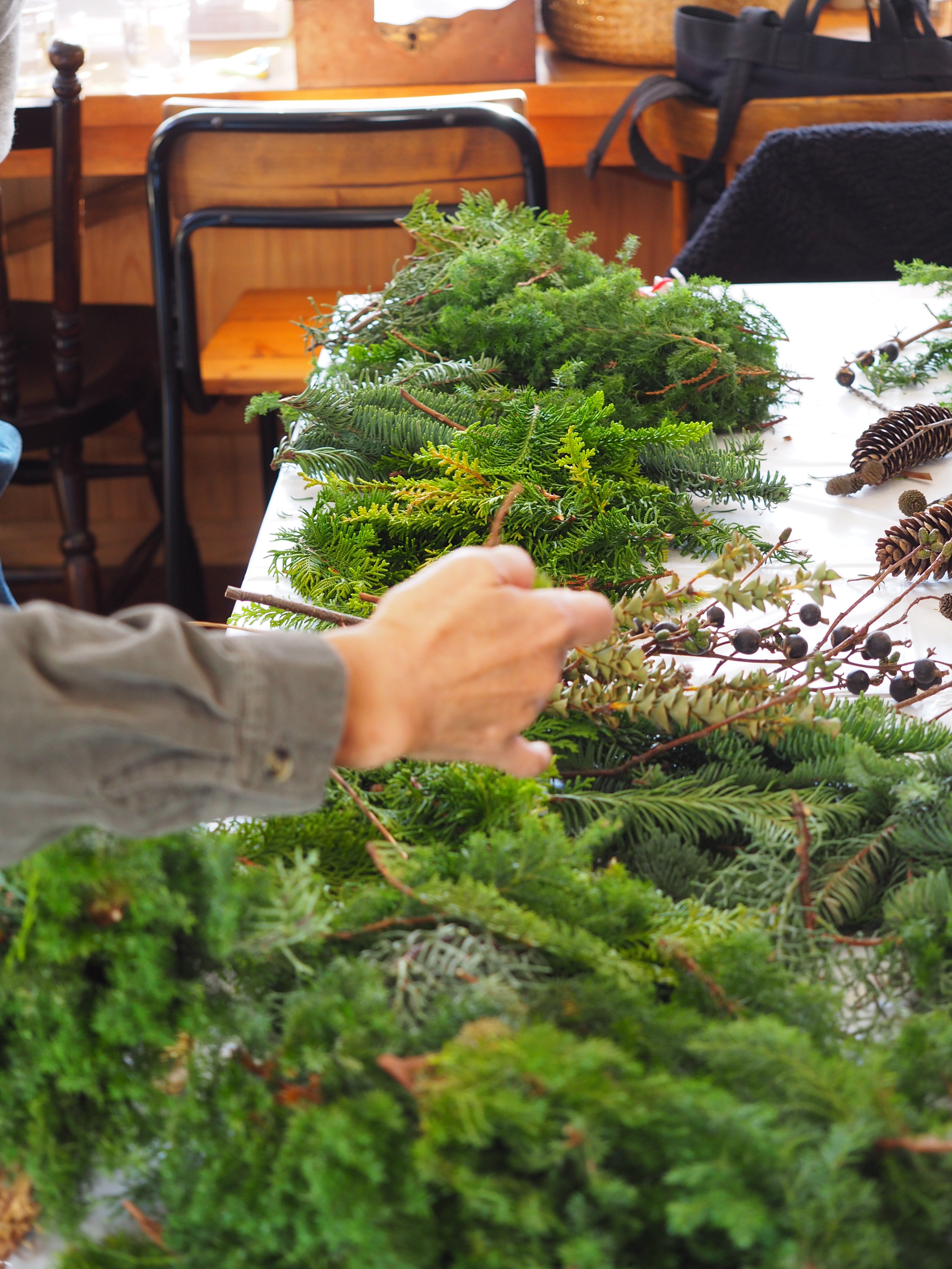 グリーンベースで生のお花のもみの木、針葉樹、ユーカリなどを