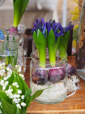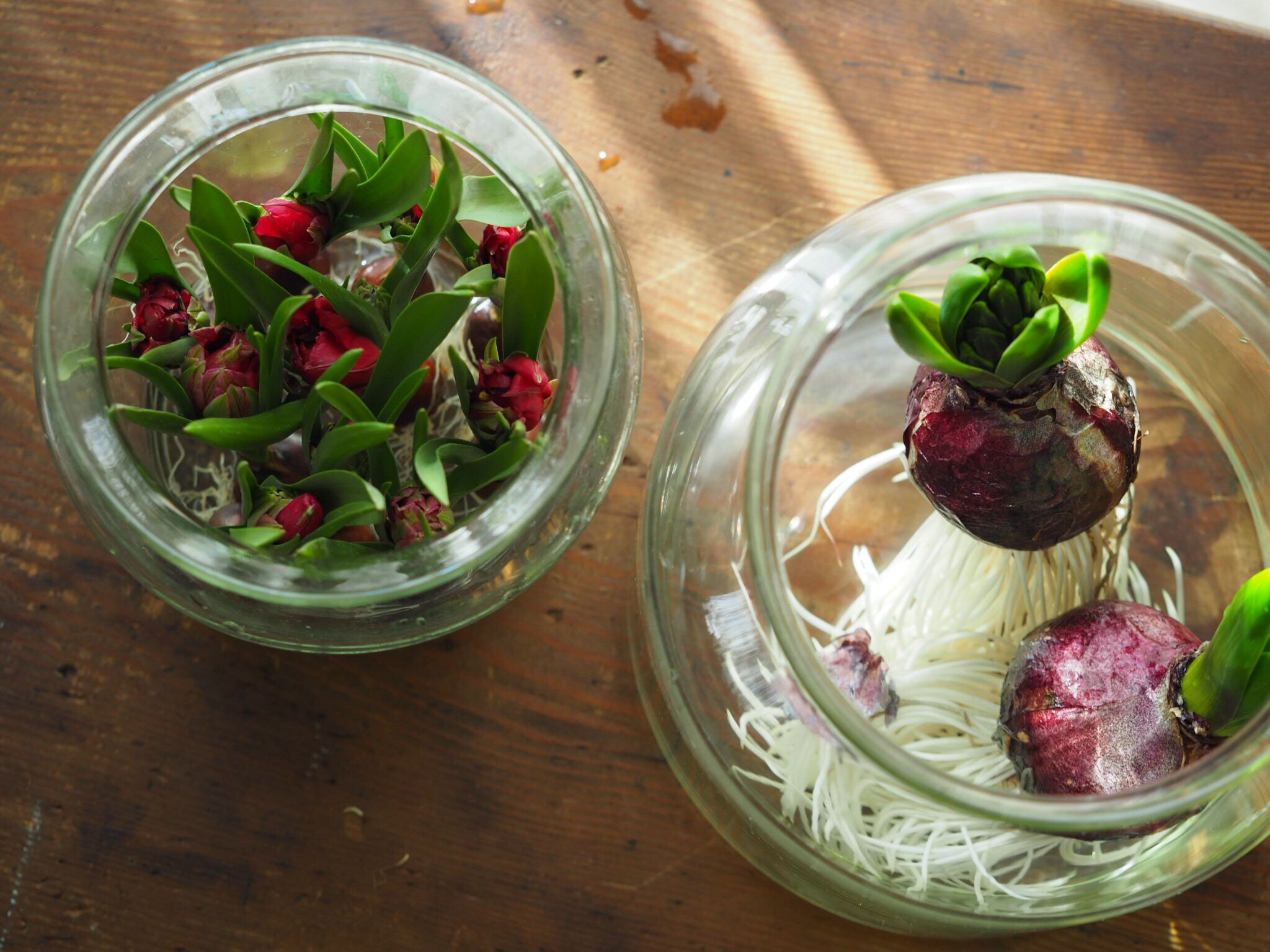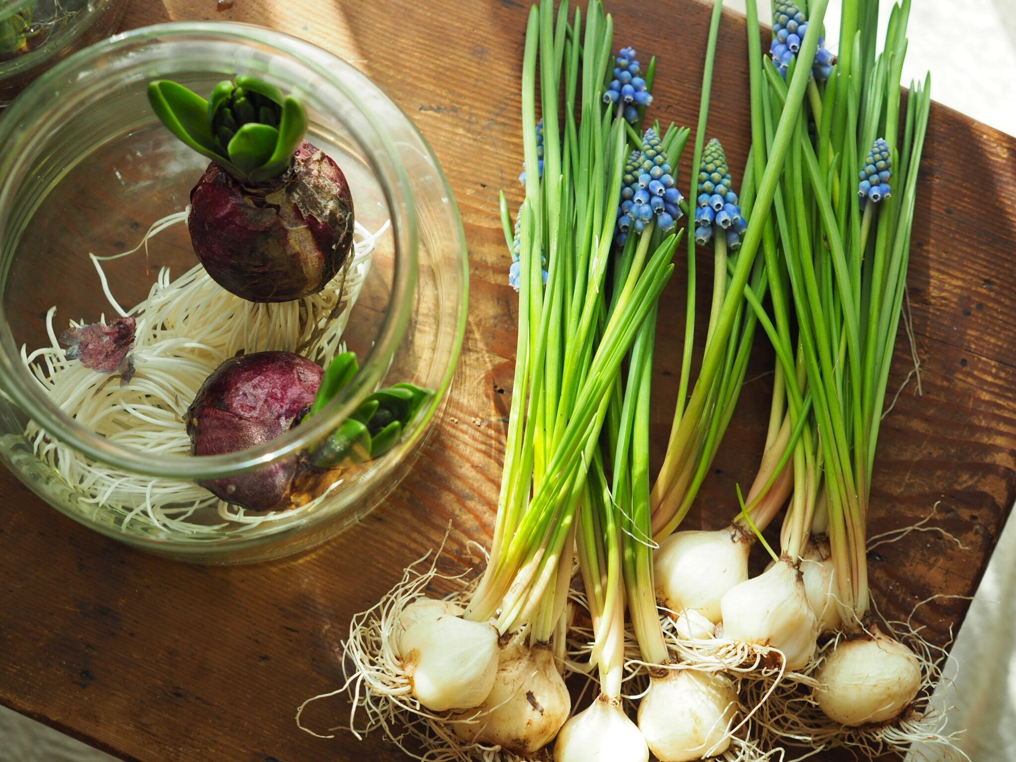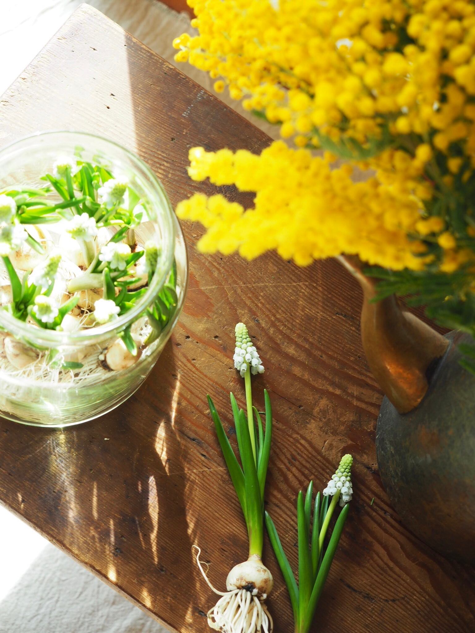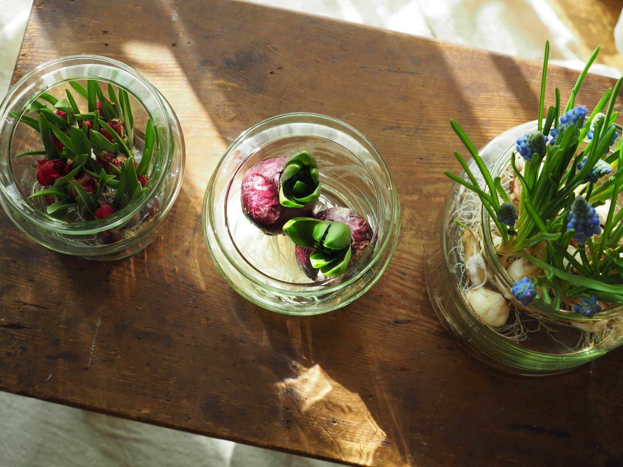 花瓶に入れたり、コップに入れたり、お皿に乗せたり。今の時期しか出回らない春の球根たち。