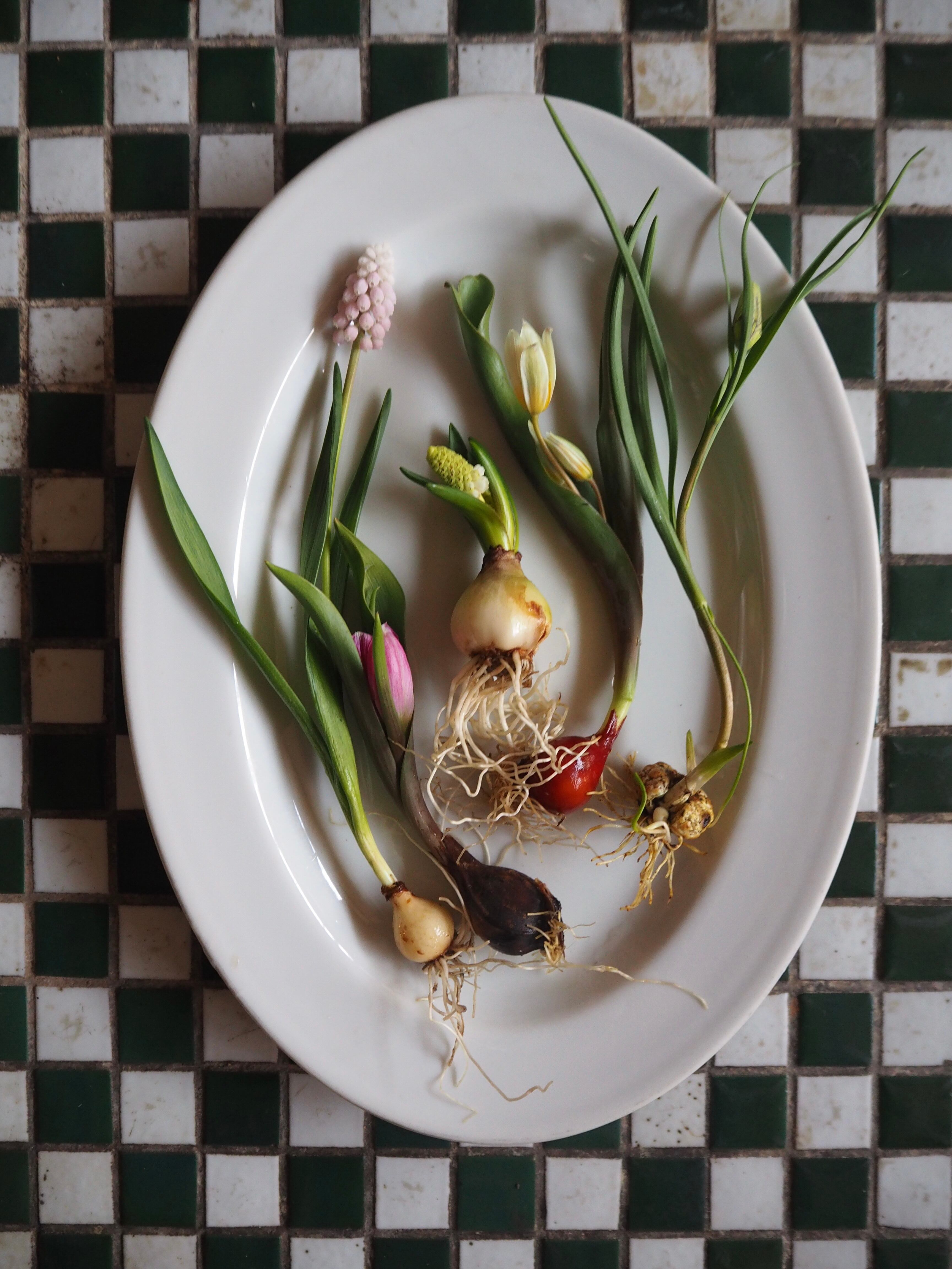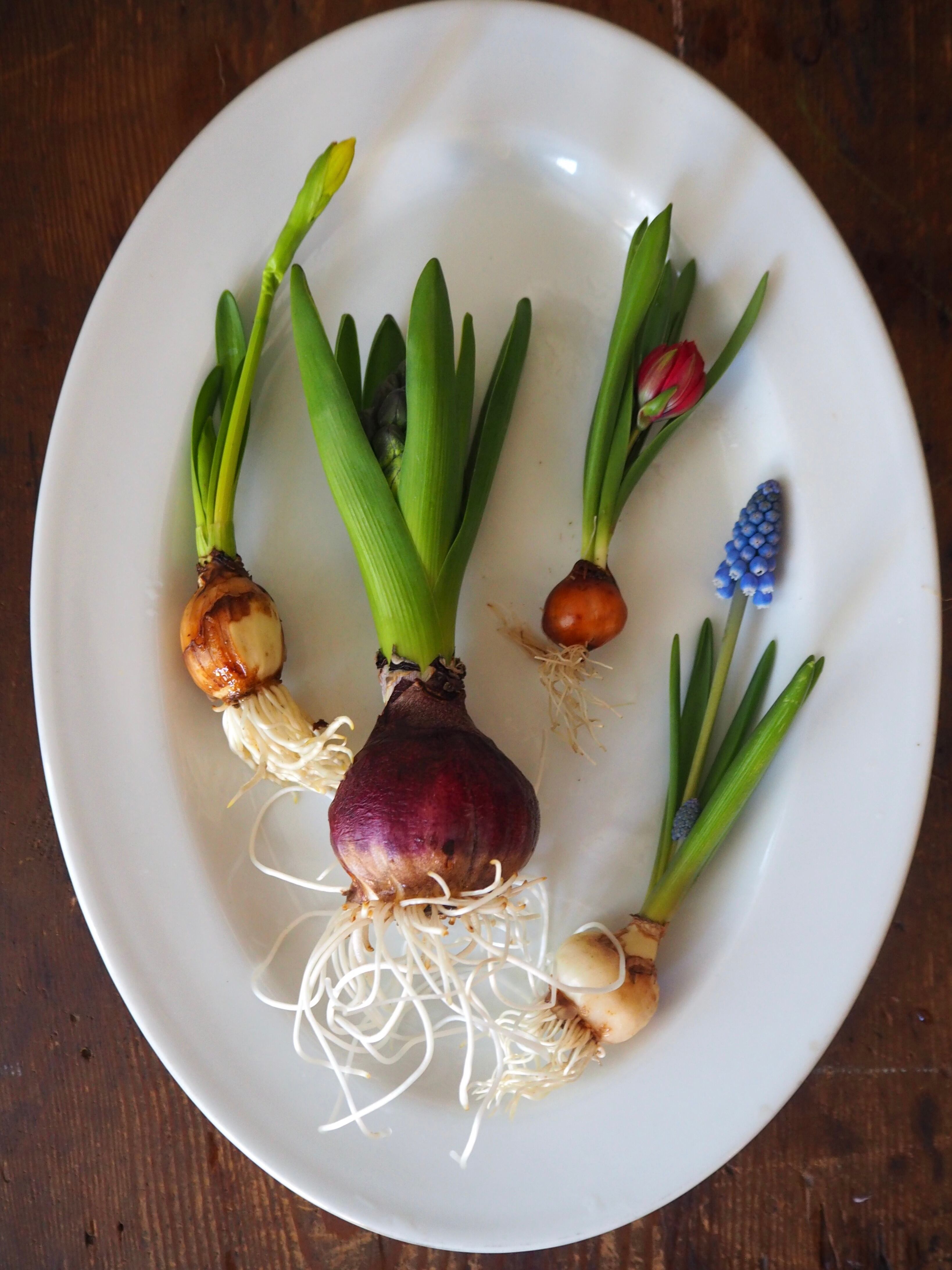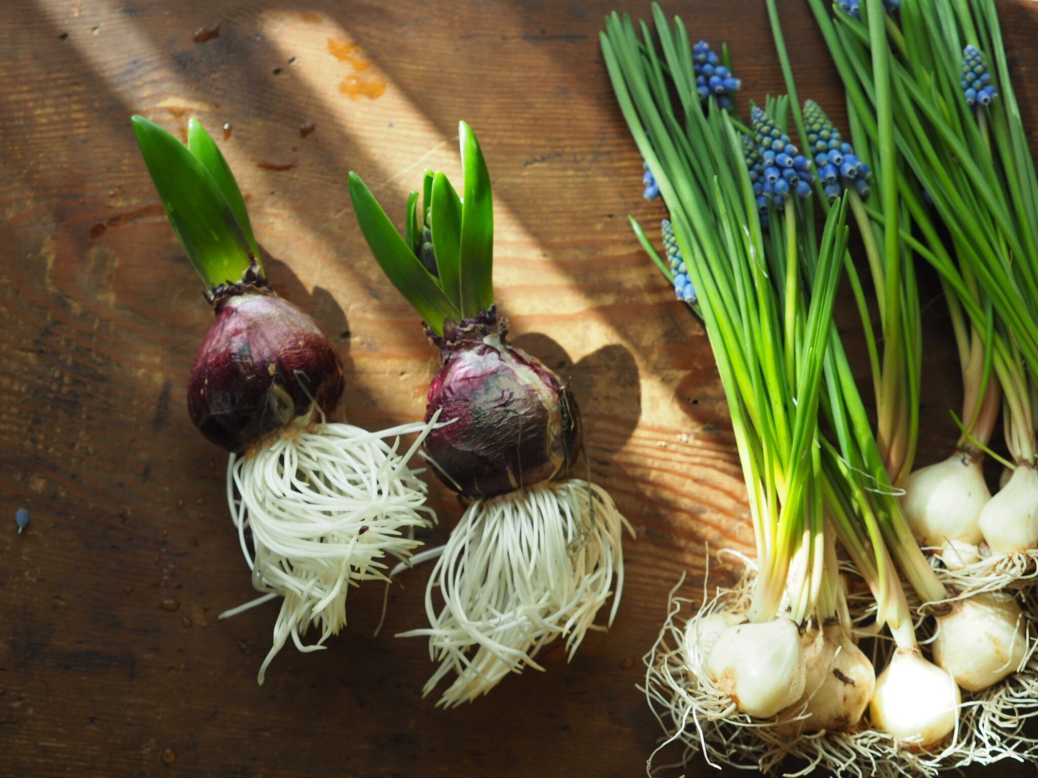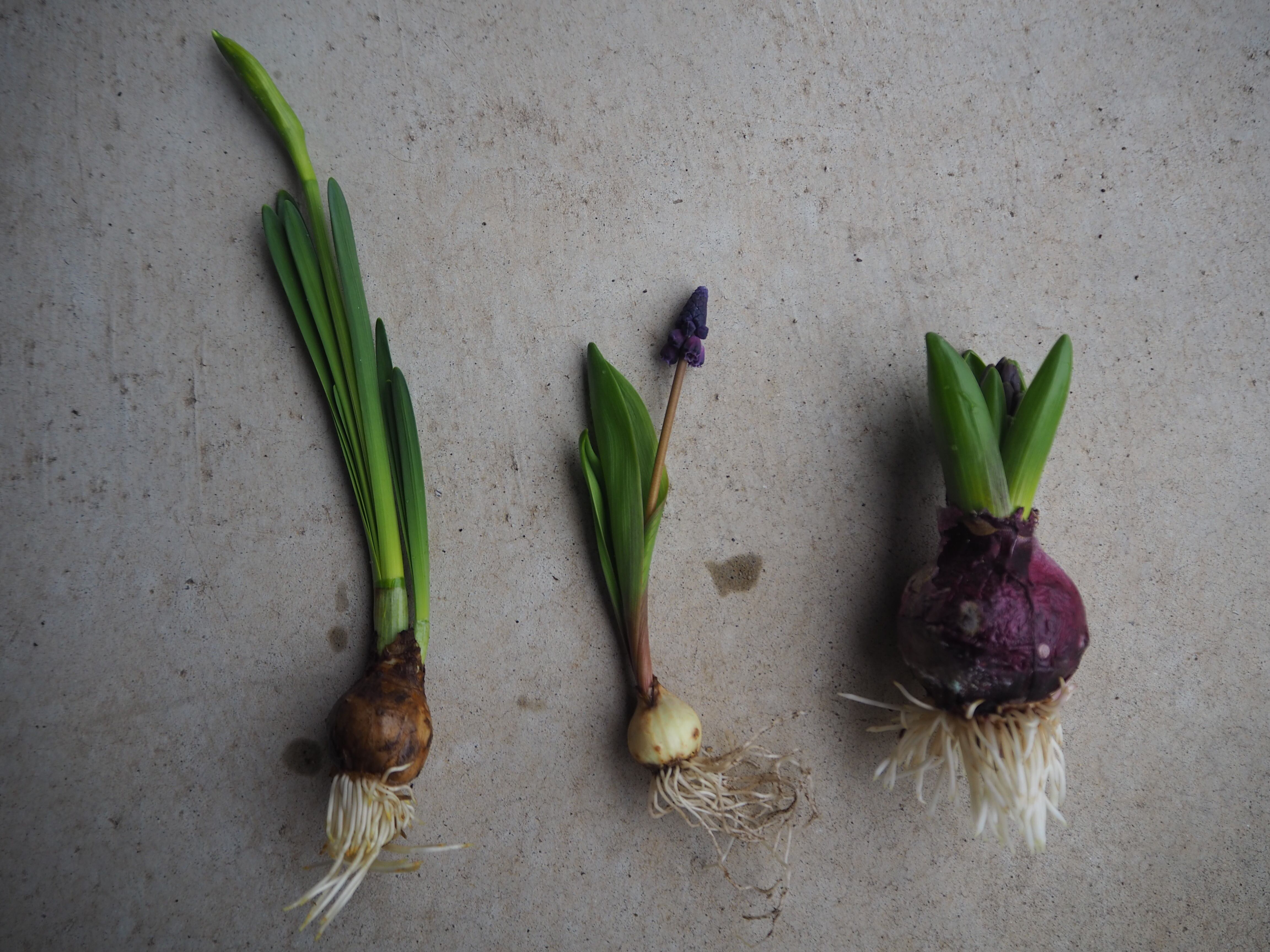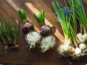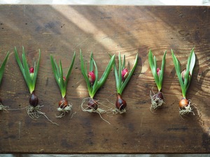 花瓶に入れたり、コップに入れたり、お皿に乗せたり。今の時期しか出回らない春の球根たち。